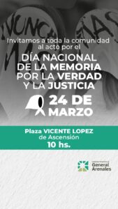 El Gobierno Municipal de General Arenales invita a toda la comunidad a participar del acto conmemorativo por el Día Nacional de la Memoria por la Verdad y la Justicia, que se llevará a cabo el próximo 24 de marzo.